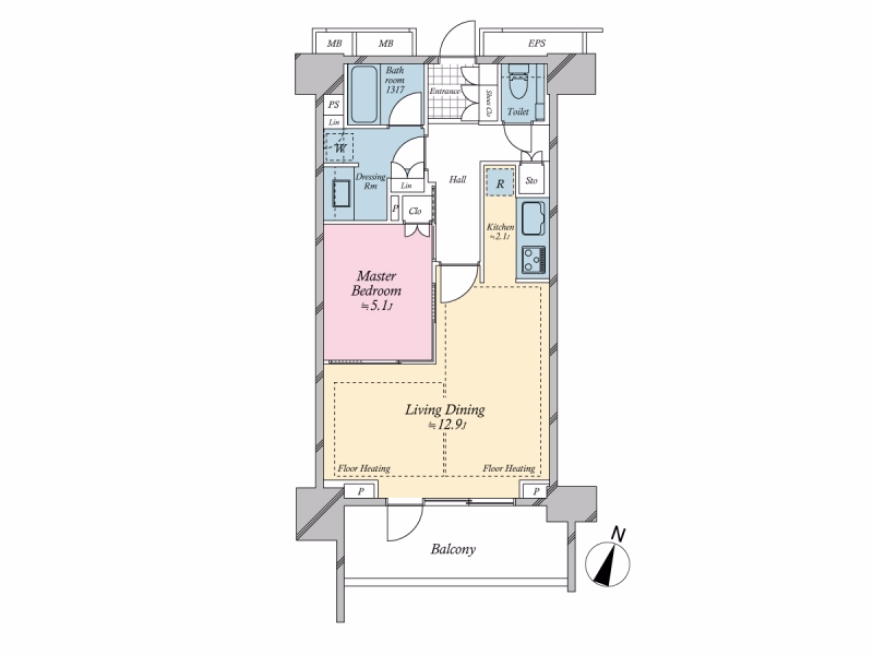 - Spacious LDK (~15.0m²) with floor heating